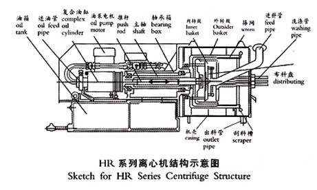 主電機(jī)帶動套裝的內(nèi)、外轉(zhuǎn)鼓全速旋轉(zhuǎn),物料由進(jìn)料管連續(xù)引入,均勻分布到內(nèi)轉(zhuǎn)鼓內(nèi)段濾網(wǎng)壁上,在離心力作用下,液相物穿過濾網(wǎng)和轉(zhuǎn)鼓壁濾孔排出,經(jīng)排液管排出機(jī)外,固相物截留在內(nèi)轉(zhuǎn)鼓形成環(huán)形濾餅層。內(nèi)、外轉(zhuǎn)鼓同速旋轉(zhuǎn)的同時,在活塞推動下,內(nèi)轉(zhuǎn)鼓連續(xù)軸向往復(fù)運(yùn)動,因而推料盤推動內(nèi)轉(zhuǎn)鼓濾餅層間歇不斷地向外移動排出內(nèi)轉(zhuǎn)鼓,進(jìn)入外轉(zhuǎn)鼓進(jìn)一步分離并形成環(huán)形濾餅層,內(nèi)轉(zhuǎn)鼓外端面則推動外轉(zhuǎn)鼓濾餅層間歇不斷地向外移動排出外轉(zhuǎn)鼓,經(jīng)刮料槽排出機(jī)外。